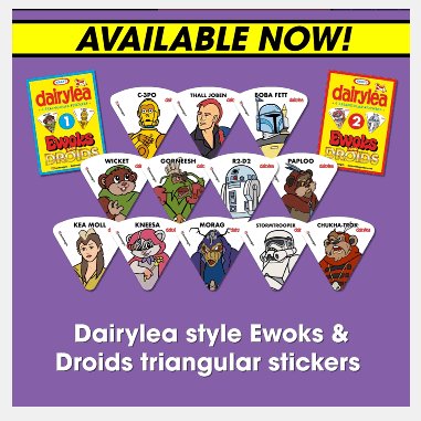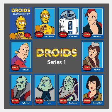 Australian 'cards' made by sticking wrapping paper to cardboard! - 1977 UK Touch Tees - Very cute Stickers & and transfers from daveevansillustration.com - 2011 Iron on t-shirt transfers UK Farrer - 162 LEGO mini-fig cards - 2010 US 'Hello Wars' (A Hello Kitty + Star Wars 'mash-up) stickers UK Robots and Cyborgs 'fan-made' Battle Game, probably 2004 or later (I, Robot) These images are from www.anakinworld.com/ 2011 These images are from www.bowmansgreen.bigcartel.com 20?? Dairylea Style Droids & Ewoks triangular stickers There are also sets for Star Warriors and Manga Style cards