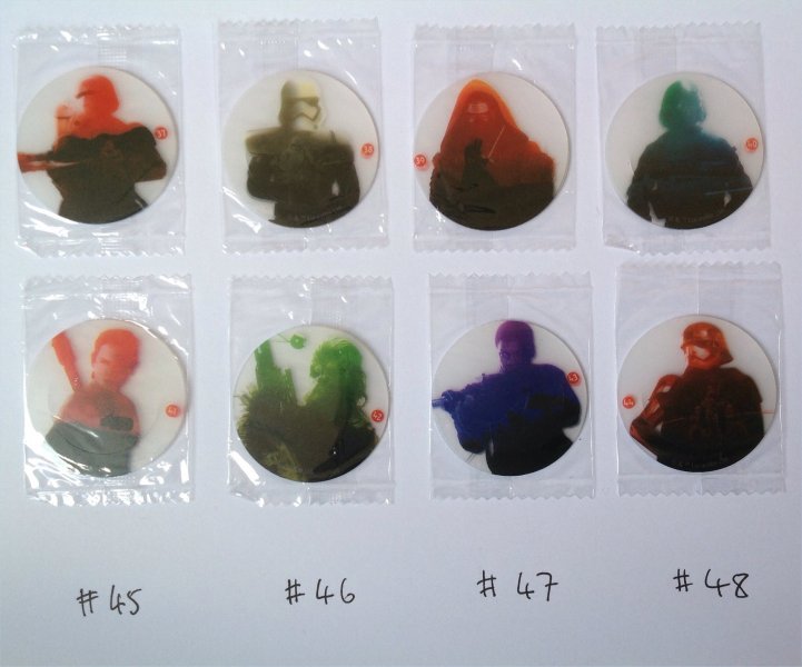 European Bon Bon Buddies Fruiticles 60 disks, 12 stickers and a game sheet - 2017 Mexican FUD Snax cards, (set of 10) - 2019 UK Topps The Rise of Skywalker, 99 Basic Cards, inserts, LEs, patches and tins - 2019 General Mills The Rise of Skywalker Tattoos (set of 6) 2019 US McDonalds stickers and game cards sheet (set of 10) - 2019
