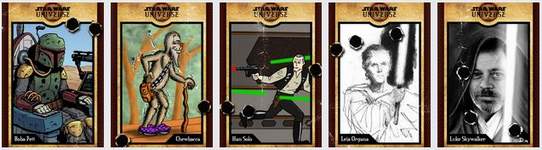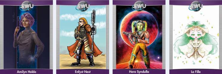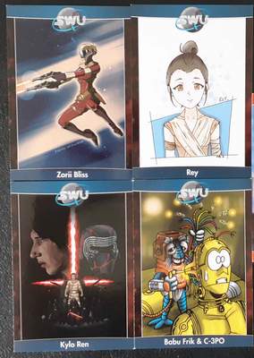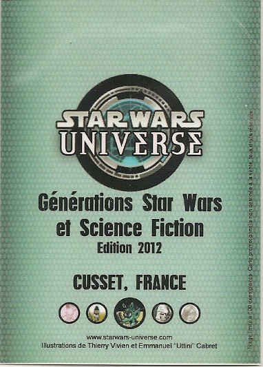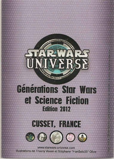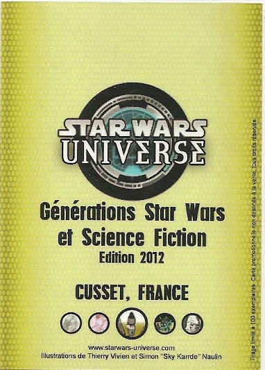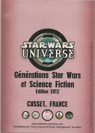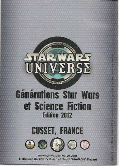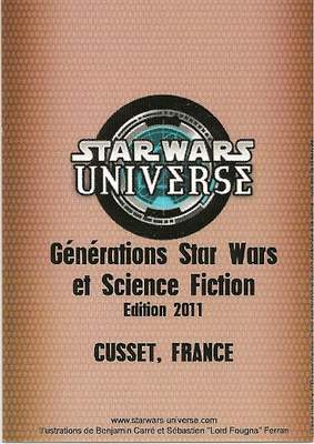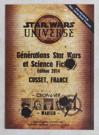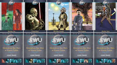 Star Wars cards from Génération Star Wars Cusset, France, 2011-2021 2011, set of 5 2013, set of 6 2014, set of 5 2015, set of 5 2016, set of 5 2017, set of 4 2018, set of 1 2019, set of 4 2021, set of 4 2024, set of 4 2025, set of 4 Steve Sansweet proudly show his cards at the 2011 show Here's