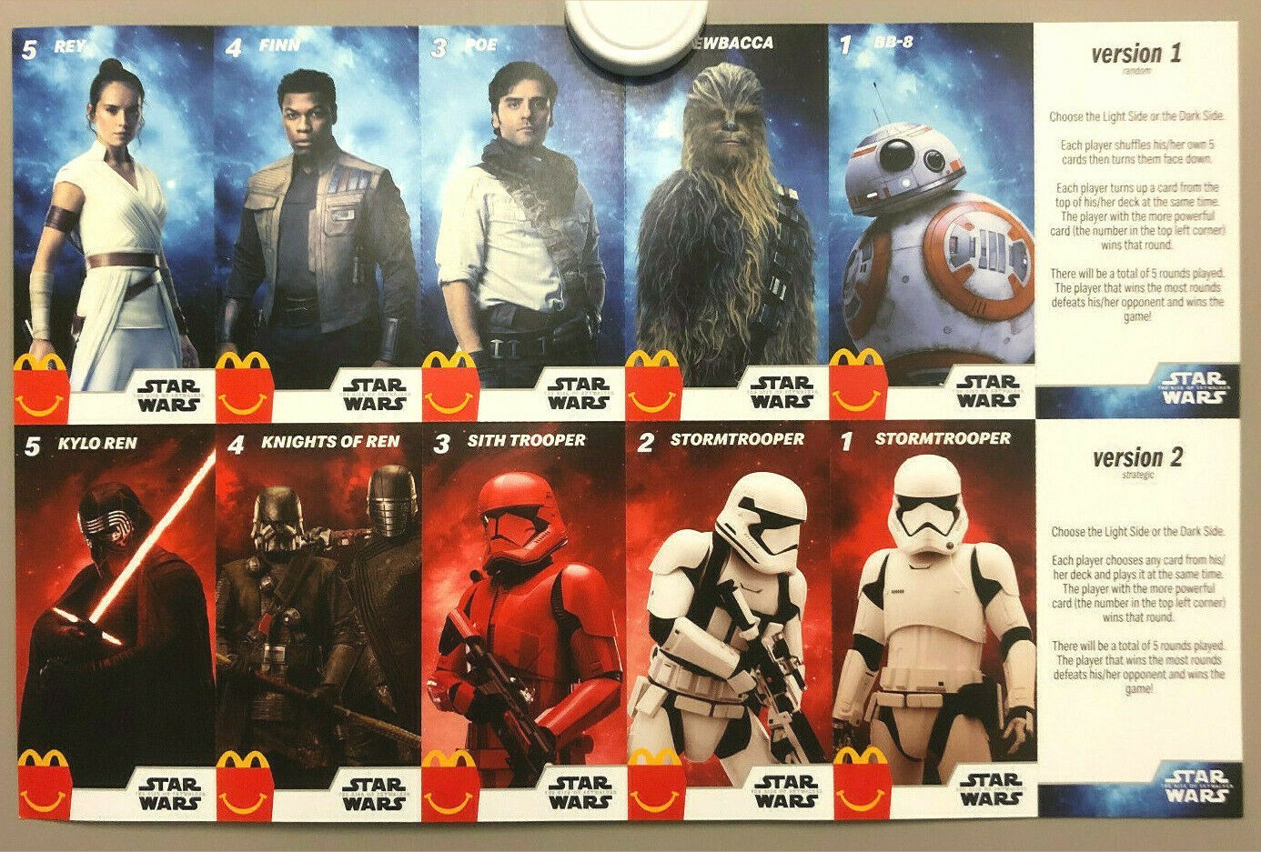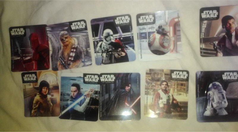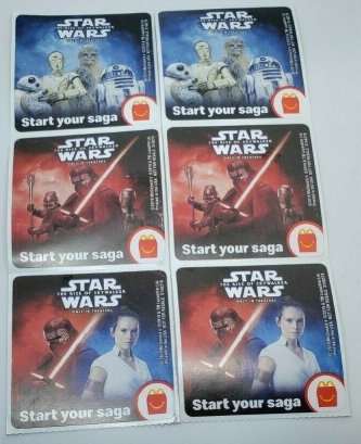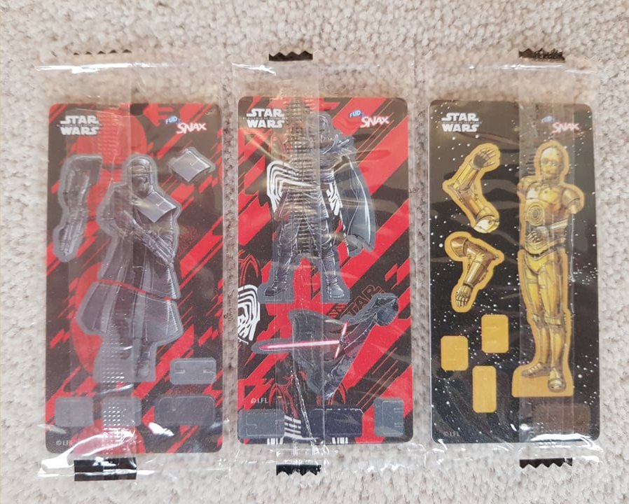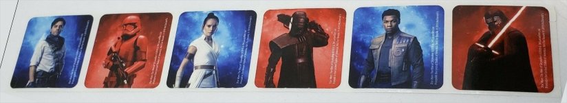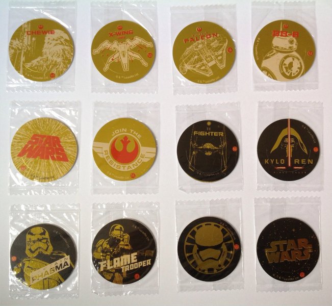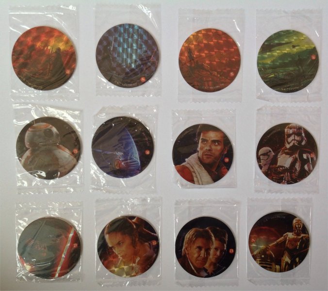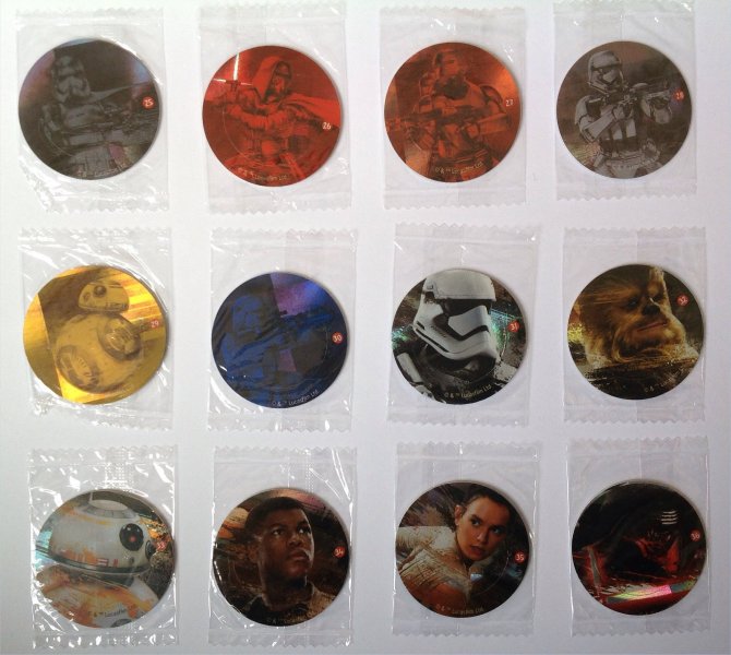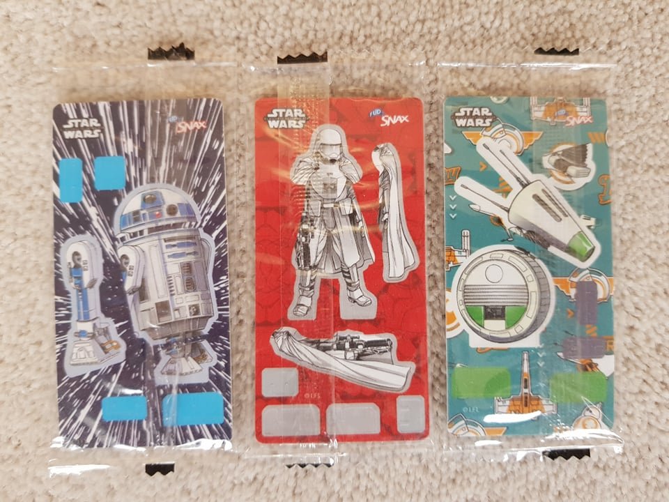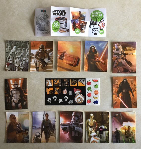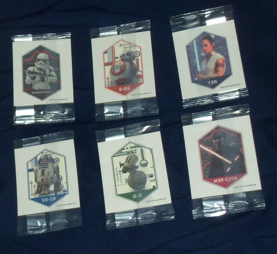 European Bon Bon Buddies Fruiticles 60 disks, 12 stickers and a game sheet - 2017 Mexican FUD Snax cards, (set of 10) - 2019 UK Topps The Rise of Skywalker, 99 Basic Cards, inserts, LEs, patches and tins - 2019 General Mills The Rise of Skywalker Tattoos (set of 6) 2019 US McDonalds stickers and game cards sheet (set of 10) - 2019