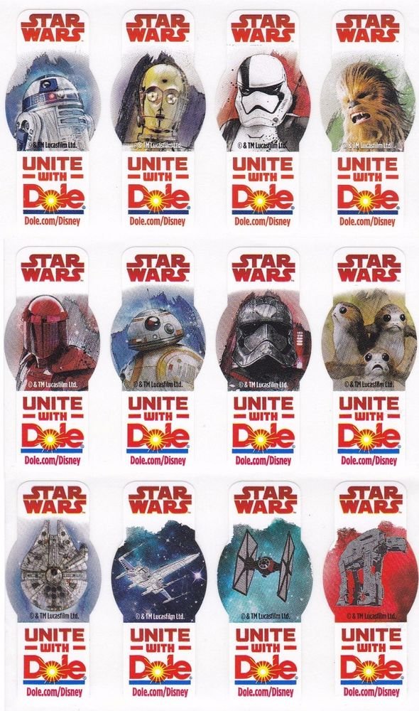 Italian Kinder Magnetic sticker cards (set of 10) - 2017 USA Dole The Last Jedi fruit stickers (set of 12) - 2017