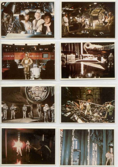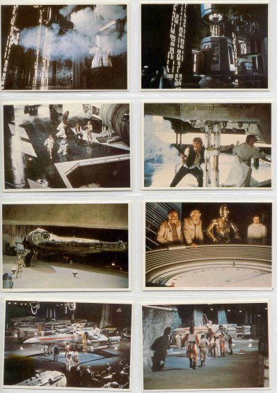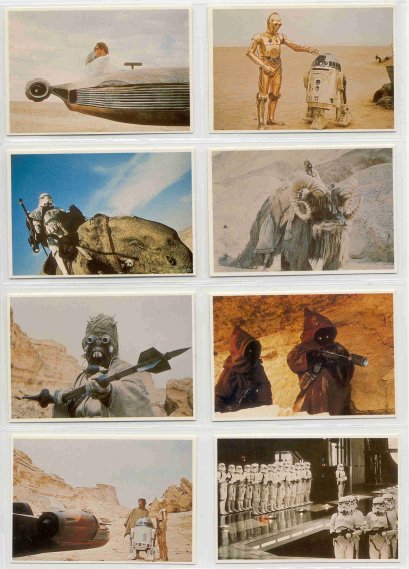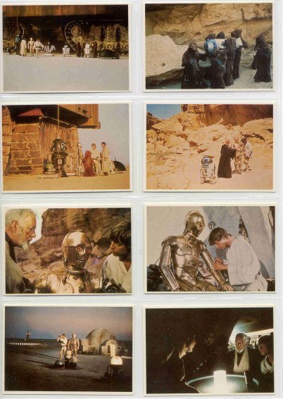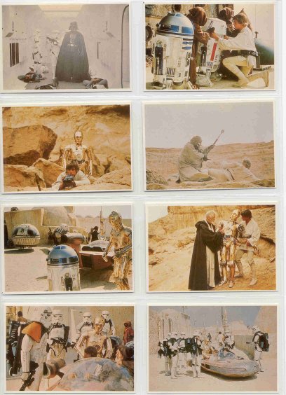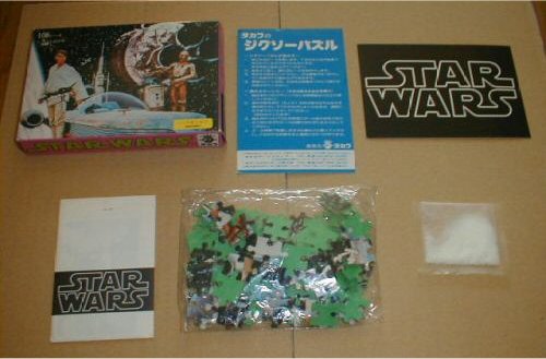 The Takara cards came in small white envelopes inside Takara Star Wars puzzles. There were eight different 108-pieces puzzles, and each stapled envelope held five cards (each about 2 1/2 x 3 3/4 inches). But there weren't necessarily different cards in each different puzzle--sometimes they were the same five you had gotten in another puzzle box. At least the cards were always together in numerical order in batches of five, so that made it a little easier. Each box also held a much large black card (about 4x6 inches) with the SW logo in white. All the cards have Japanese writing on the back and the numbers, but no art.