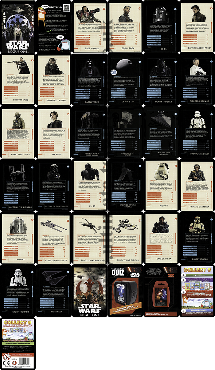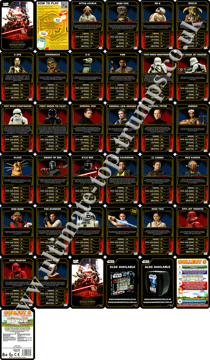 UK Top Trumps Clone Wars specials UK Top Trumps The Clone Wars - 2008 UK Movie Stars Top Trumps from FilmFlex 2001 'Ultimate' Top Trumps Black pack from PLAYADAY.COM, there is only one Star Wars card in the pack of 30 US Super Top Trumps Cards from Star Wars Insider magazine UK WinningMoves Top Trumps Rogue One - 2016 UK WinningMoves Top Trumps Rebels - 2016