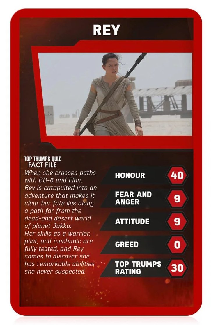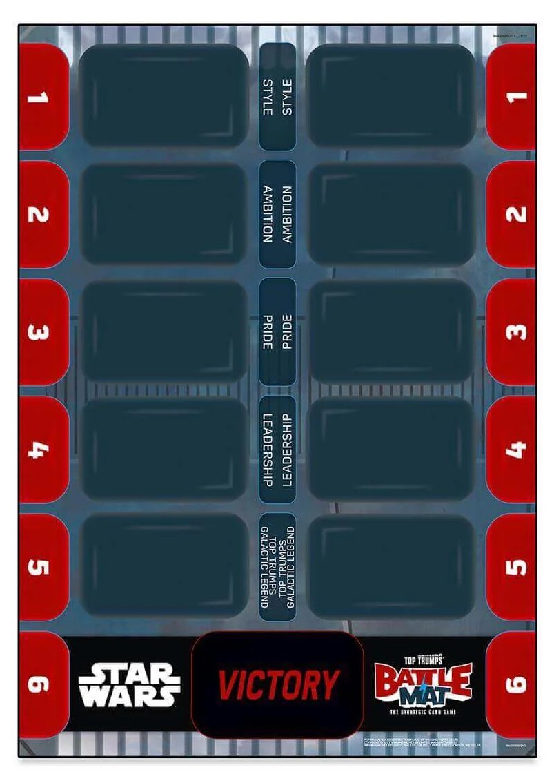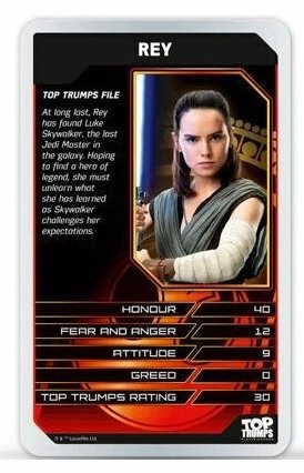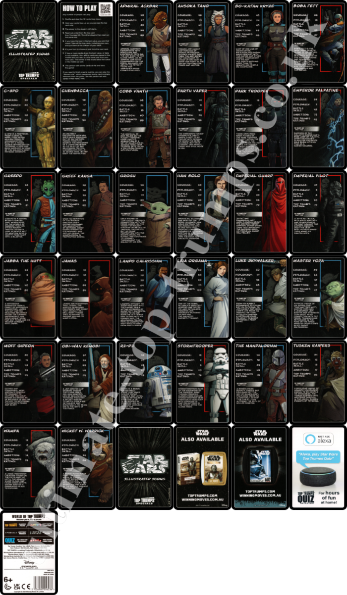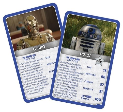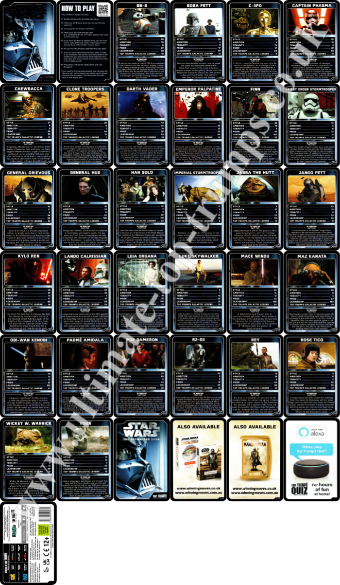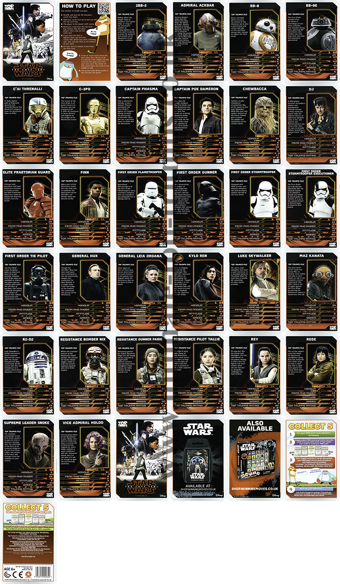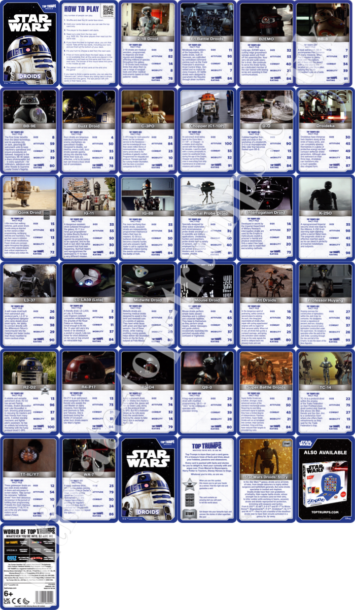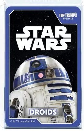 UK WinningMoves Top Trumps Episodes 1-3 & 4-6 - 2016 UK WinningMoves Top Trumps Episode 7, The Force Awakens - 2016 UK WinningMoves Top Trumps Episode 8, The Last Jedi - 2017 UK WinningMoves Top Trumps Episode 9, The Rise of Skywalker - 2019 UK WinningMoves Top Trumps, Skywalker Saga 2021 UK WinningMoves Top Trumps, Star Wars Battle Mat- 2021? UK WinningMoves Top Trumps, The Mandalorian - 2024 UK WinningMoves Top Trumps, Star Wars Illustrated Icons - 2024 UK WinningMoves Top Trumps, Droids - 2025 UK WinningMovesTop Trumps Quiz with a TwistGame, 500 Questions on 100 cards - 2016 UK Winning Moves Top Toys from Top Trumps Tournament, 30 cards including a lightsaber - 2009 Argentinean 'Retro Universe' 'Top Trumps' style cards 30 cards, 3 have Star Wars images